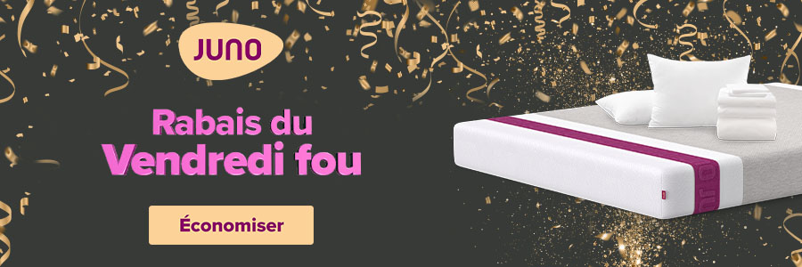 VENDREDI FOU EN AVANCE! 20% de rabais sur les lits ajustables + Achetez un matelas Juno dès aujourd’hui et recevez un ensemble de sommeil à bas prix GRATUIT, et 50 % DE RABAIS sur tous les oreillers. Voir site pour détails >