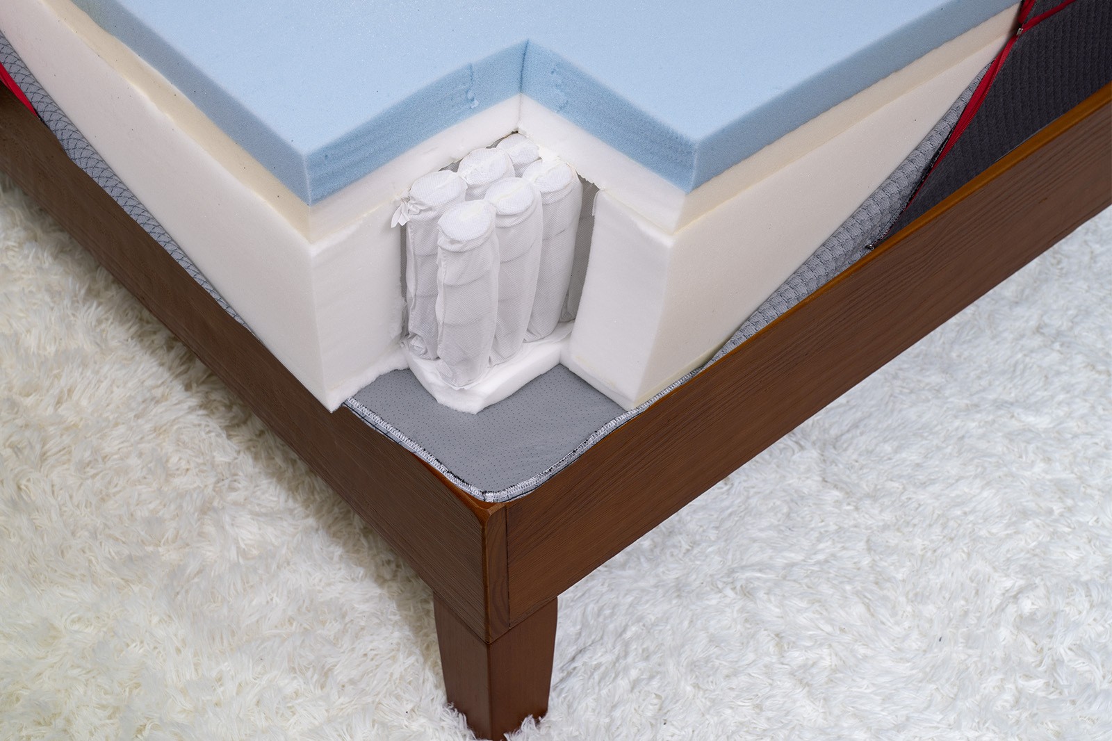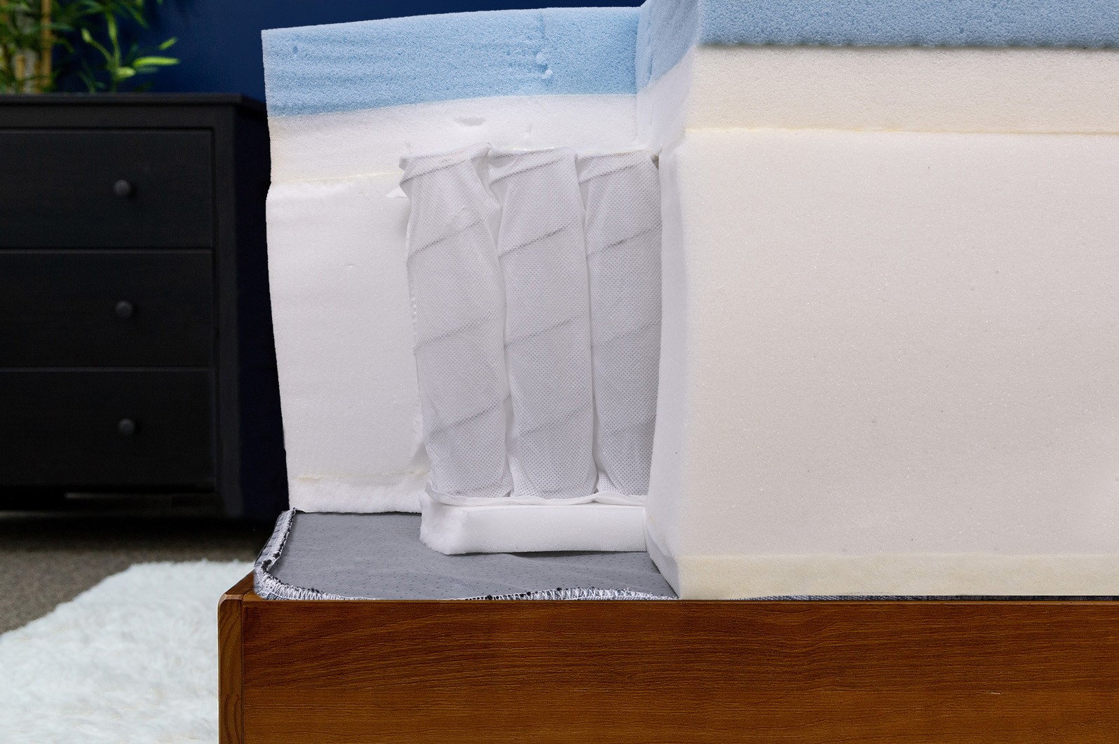 - Layer 4: Below the pocket coil layer, a 1″ layer of motion-isolation support foam provides a high-density base that stabilizes and supports the upper layers while reducing motion transfer.