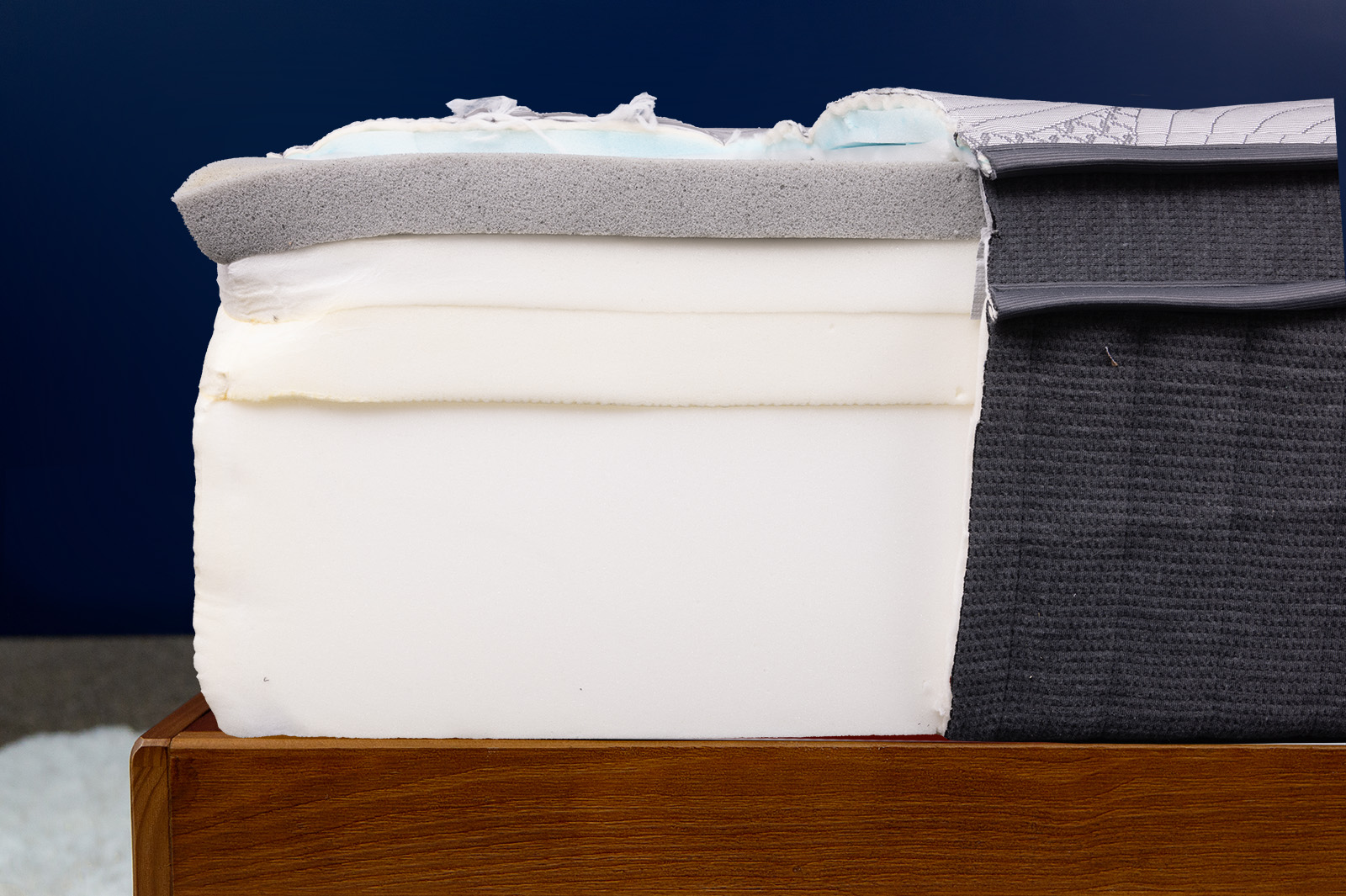 - Layer 3: 1.5″ of graphite-infused memory foam with a strip of phase-change material near the surface. This layer is intended to offer pressure relief while also drawing heat away from the body.